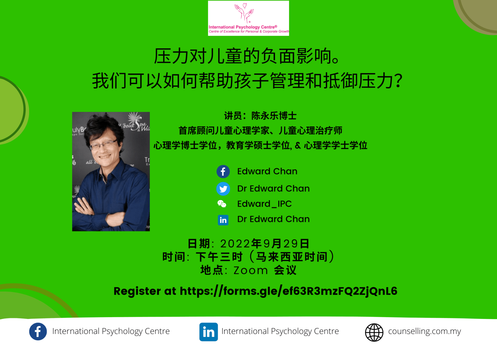 Children with chronic stress may suffer from long term negative psychological impacts. Research showed that these children have greater risks for psychological disorders such as depression, anxiety, and panic attack as well as addiction and relationships issues in the future. However, many of these mental health problems can be prevented and manage by developing their resiliency against stress. This month's mental health webinar will go into depth on these issues.